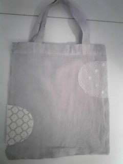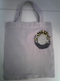 私が考えたのは、まずバックをきれいな色に染めます。白じゃ汚れるし、色があった方が楽しいしね。で、そこに一工夫する。それは絵を描くのもいいし、何かボタンとかつけたり、刺繍とかしてもいいと思うのだけど。とりあえず、サンプルで作ってみました。こんな感じで考えてます。
