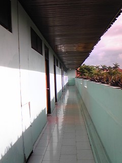 ホテルの壁が緑のクリーム色。