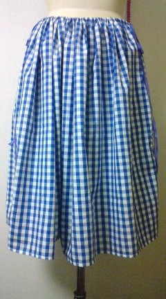 I made. I made a blue-check-skirt. It have lace in the side. On cold day,it long a skirt and put a hand in a pocket. On warm day, show one's knees.